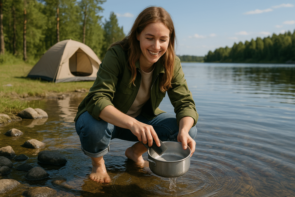 基本的にはキャンプ場にある炊事場を使い、汚れは紙や布で拭き取ってから洗うようにしましょう。